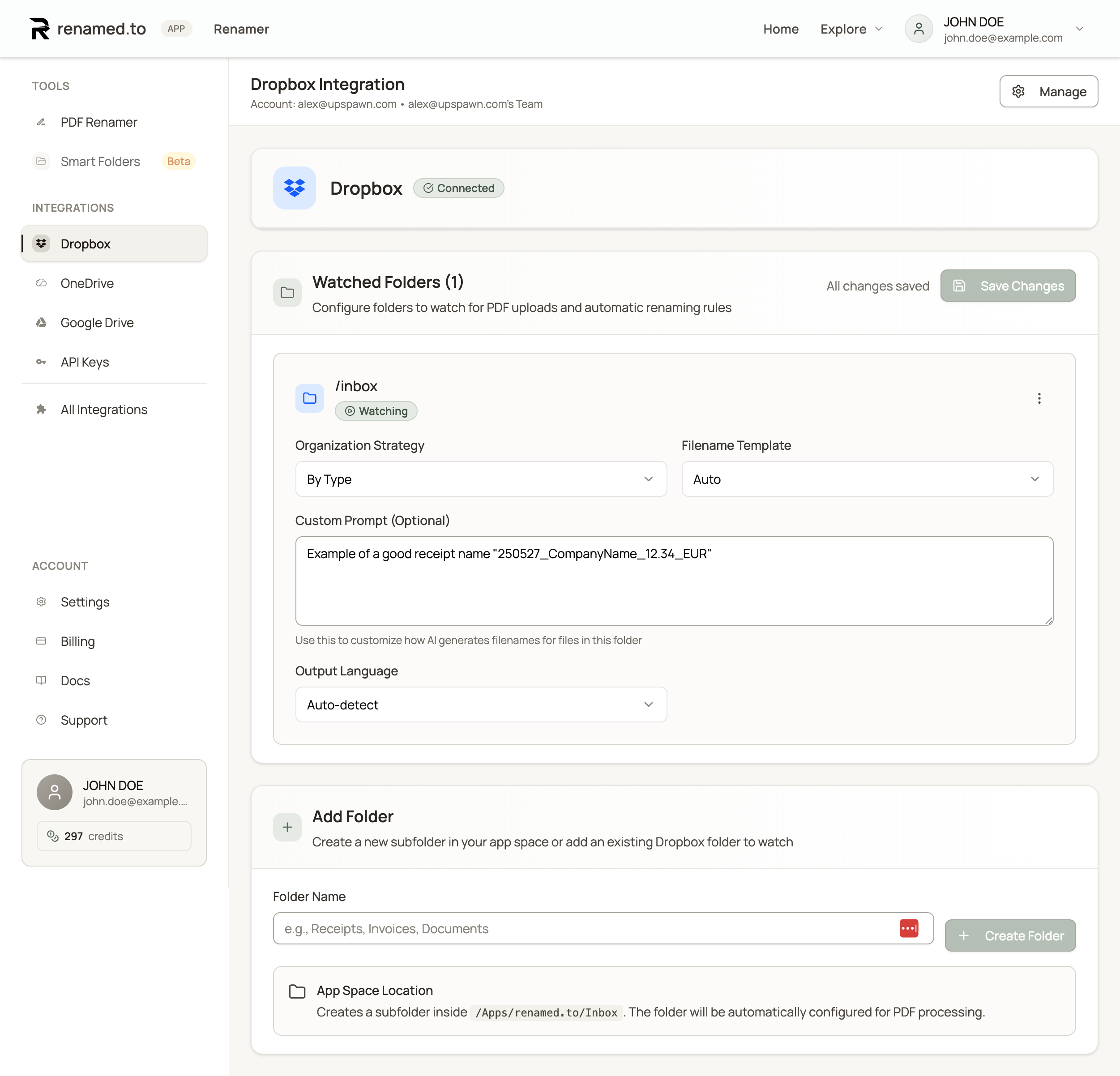 In Renamed.to's Dropbox integration, this happens inside an App Folder inbox/output flow, so it stays scoped and predictable: